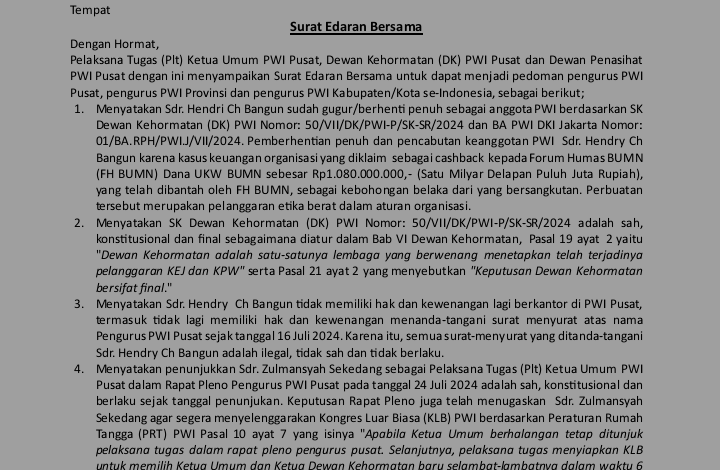 Pemberhentian ini didasarkan pada Surat Keputusan Dewan Kehormatan PWI Nomor: 50/VII/DK/PWI-P/SK-SR/2024 dan Berita Acara PWI DKI Jakarta Nomor: 01/BA.RPH/PWI.J/VII/2024.