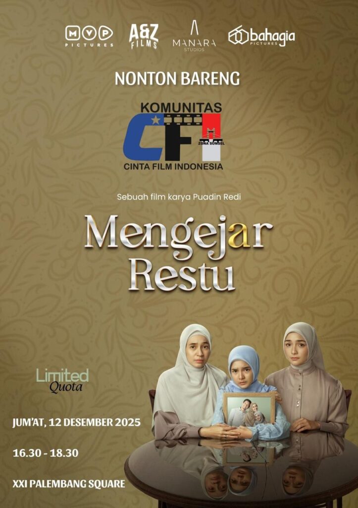 PALEMBANG, Inilink.com — Komunitas Cinta Film Indonesia (KCFI) Sumatera Selatan membuka kesempatan bagi pecinta film untuk mendapatkan tiket nonton bareng (nobar) film Indonesia berjudul “Mengejar Restu”, karya sutradara Puadin Redi.
